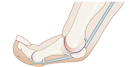 Aan de binnenzijde van de enkel maakt de pees een bocht en glijdt door een smalle tunnel: de tarsale tunnel. Bij het buigen van de teen, tijdens het lopen, glijdt de pees heen en weer door deze tunnel. Er kunnen verschillende redenen zijn waardoor de pees niet meer goed door de tunnel glijdt. Zo kan extra spanning rond de tunnel verhinderen dat de teen omhoog kan bewegen.